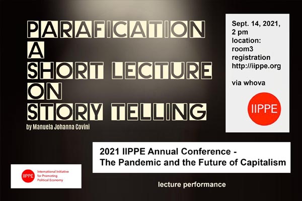 Title: The Pandemic and the Future of Capitalism lecture preformance 12.-19.09.2021 IIPPE Conference 2021 Committee on Activism IV. Truth, media, Debord and Urban Space Tue 14 Sep 14:00–15:45 BST Moderator: Matthias Kispert https://iippe.org/iippe-annual-conferences/11th-annual-conference-in-political-economy/ https://whova.com/portal/webapp/iippe_202107/Agenda/1904495 |